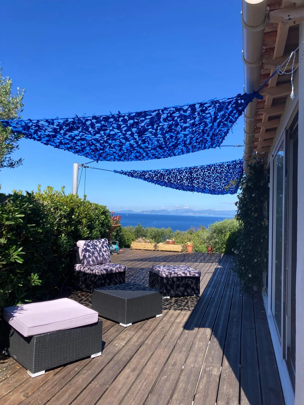 Aproveite seu terraço o ano todo, deixando entrar ar e luz com nossa rede de camuflagem. Retome o controle do seu terraço.