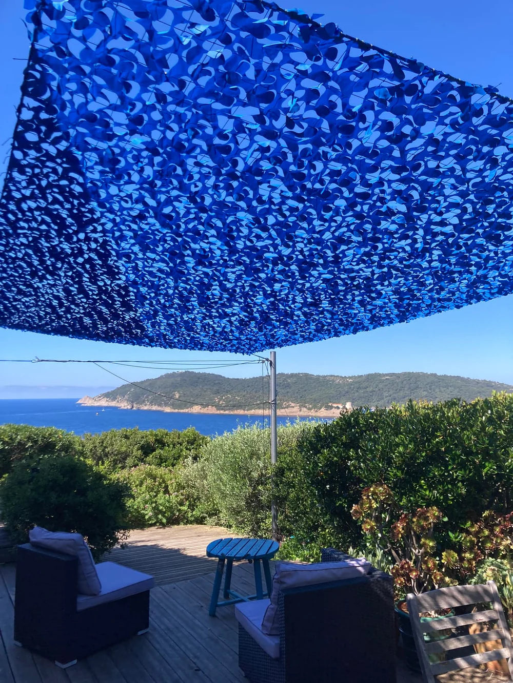 Una red de camuflaje es un tipo de material para sombra que puede usarse con fines militares o civiles, ya sea para camuflaje o como protección solar. También sirve como medio discreto y eficaz para observar animales salvajes durante salidas de caza, o simplemente con fines decorativos. Existen en varios materiales y tamaños para adaptarse a diferentes entornos. Las redes azules permiten ocultarse activamente mientras se integran perfectamente en el paisaje exterior. Originalmente creada para la guerra, fue ampliamente utilizada por marinos y soldados británicos durante las dos guerras mundiales. Hoy en día, existen en muchos colores para adaptarse a cualquier entorno exterior.